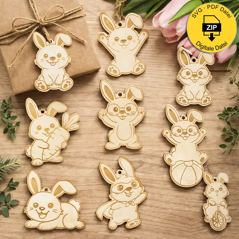 Die digitale Laser- & Plottervorlage enthält mehrere niedliche Hasenmotive mit praktischem Loch zum Aufhängen. Perfekt als Geschenkanhänger, kleine Osterdeko oder „Ach-ist-das-süß“-Extra am Präsent.