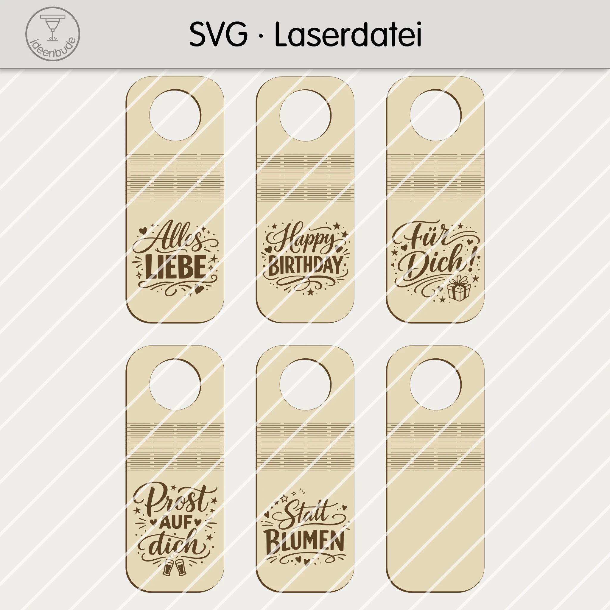 Gib deinen Wein-, Sekt- oder Champagnerflaschen eine besondere Note – mit stilvollen Flaschenanhängern zum Laserschneiden. Die Datei beinhaltet fünf unterschiedliche Designs mit detailreichen Gravuren.