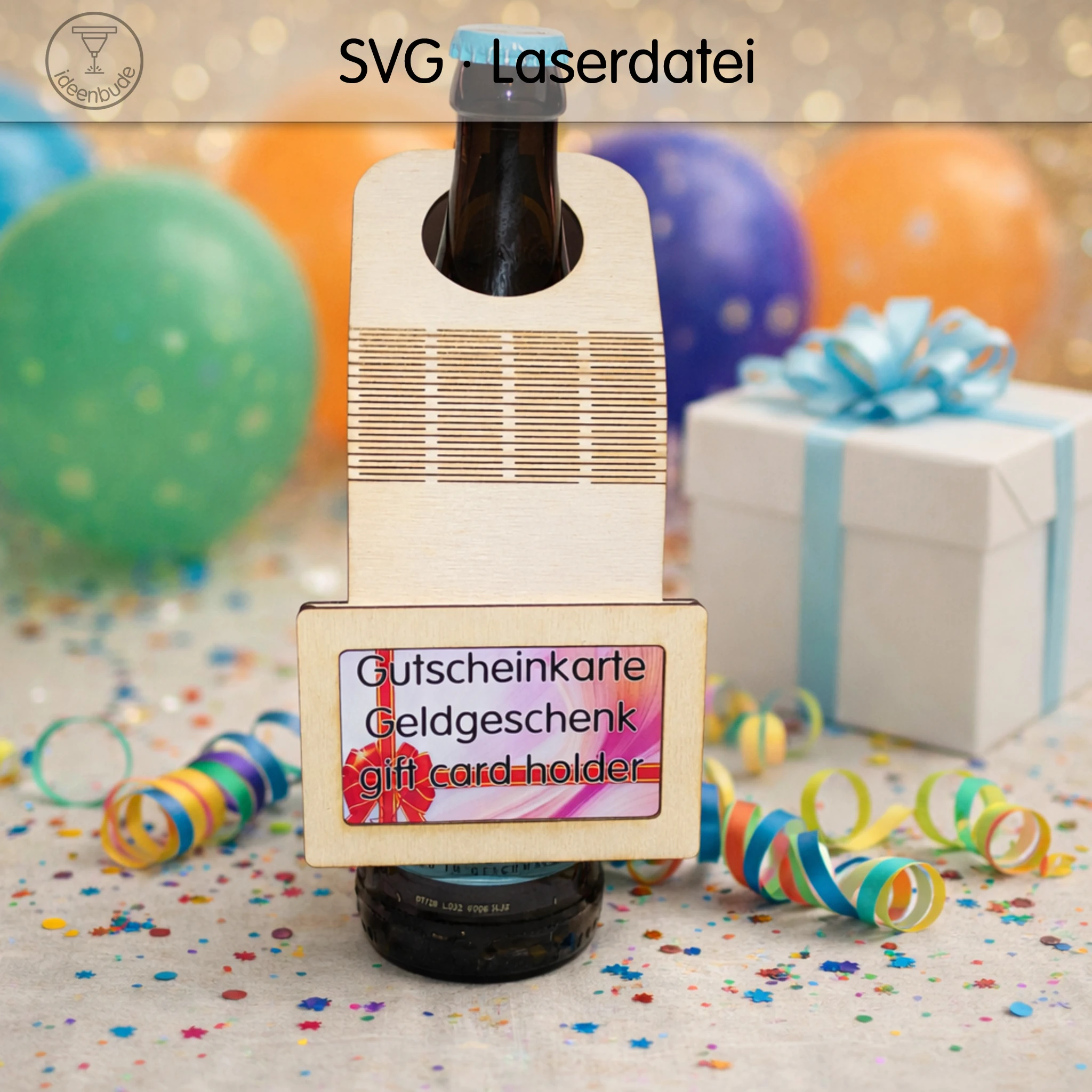 Diese Laser-Vorlage aus Holz ist die perfekte Lösung für kreative Geldgeschenke. Dank der raffinierten Kerf-Technik (Living Hinges) lässt sich der Halter flexibel über alle gängigen Flaschen platzieren. Ideal für Gutscheine oder als originelles Geldgeschenk – schnell gefertigt und ein echter Hingucker auf jeder Feier.