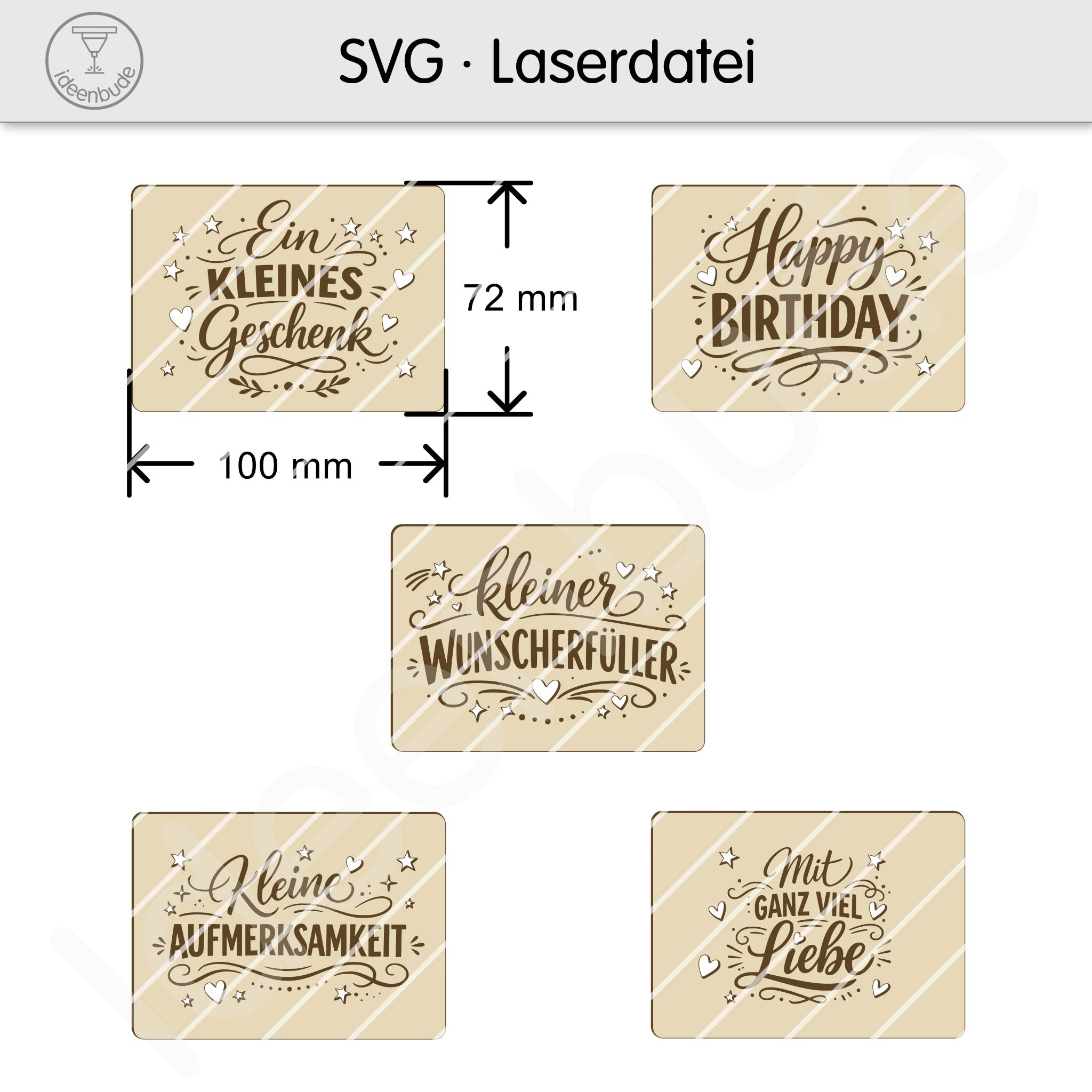 Mit diesem Set erhältst du 5 liebevoll gestaltete Laser-Vorlagen für stilvolle Gutscheinverpackungen aus Holz. Die praktischen Schiebehalter sind perfekt geeignet für Gutscheinkarten im Scheckkartenformat (z. B. Tankgutschein).