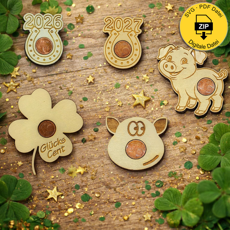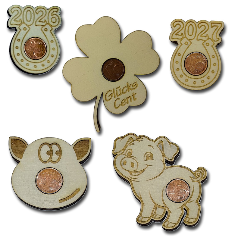 Diese Laservorlage für Glücksbringer aus Sperrholz bringt Glück auf den Punkt – oder besser gesagt: auf den Cent.