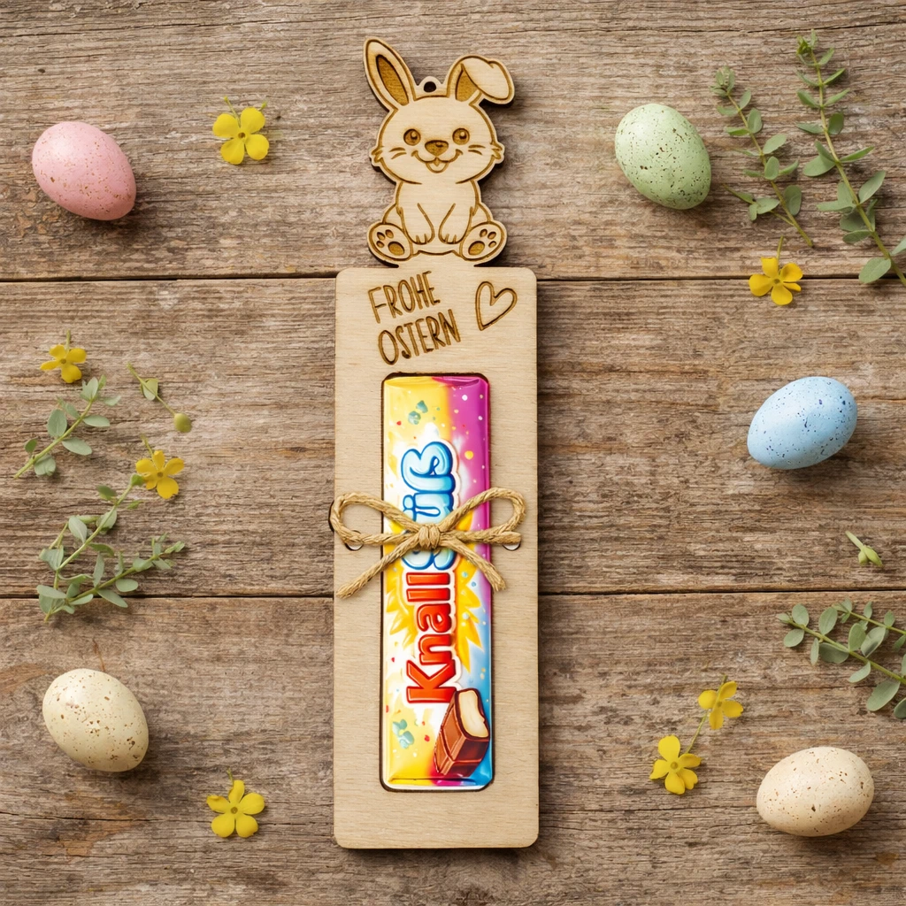 Diese Laservorlagen für Oster-Schokohalter mit Hasenmotiv eignen sich perfekt für liebevolle DIY-Ostergeschenke aus Holz.